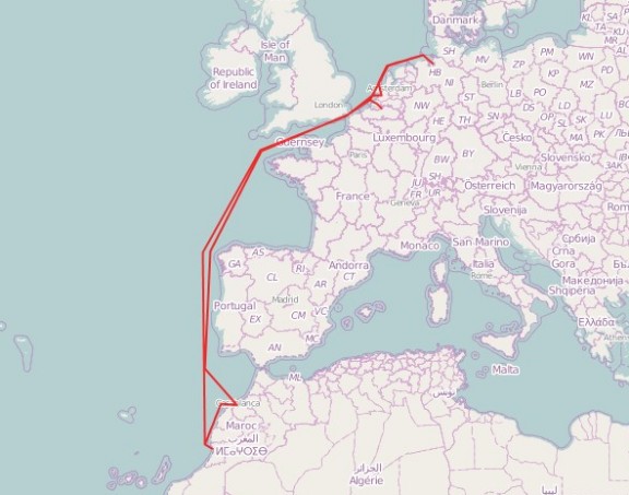 Am 29. Mai abends in Agadir abgefahren. Nun also leider schon zurück. Anfangs fast genau Kurs 0 Grad. Das Wetter nicht immer gut. Fünf Tage sind geplant bis zum Lotsen Rotterdam.