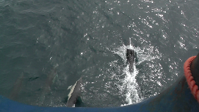 Nachmittags dann ALARM: Wolfgang hat Delfine gesehen. Ich bin gleich zum Bug gerannt. Durch die Panamaklüse konnte ich tolle Videoaufnahmen von den Tieren machen, die sich vor der Bugnase mit offensichtlichem Vergnügen tummelten. Zum ersten Mal habe ich nun Videos von Delfinen, ich war hoch zufrieden. Unten Schnappschüsse aus den Videos.