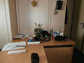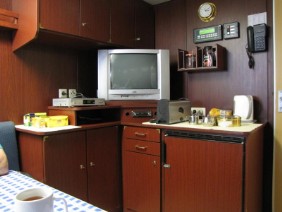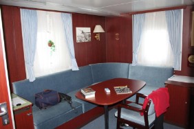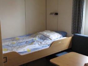 Mein Mann hat die großzügige „Eigner Kammer“ mit separatem Wohnraum auf dem E-Deck bezogen und ich meine Einzelkammer auf dem B-Deck. Meine Kammer war klein, es gab außer Bett/Schrank noch eine kleine Sitzecke und einen kleinen Tisch, und einen Kühlschrank, der aber leider kaputt war.