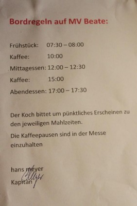 Nach durchlesen der Bordregeln war klar, dass wir pünktlich zu den Mahlzeiten erscheinen würden.