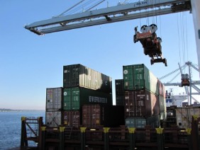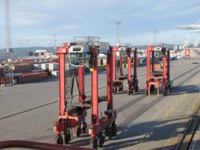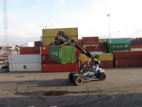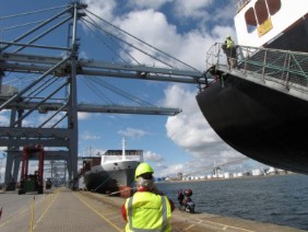 Ein Hafenarbeiter fragte wohin wir wollen und bot uns an uns auf seinem Containercurler bis zum Ausgang zu fahren. Wir waren gerade aufgestiegen, als ein Wagen der Security scharf bremste und der Fahrer uns fragte, wohin wir wollen und von welchem Schiff wir kämen. Wir dürften nicht einfach so ohne Helm und Warnweste im Hafen rum laufen!
