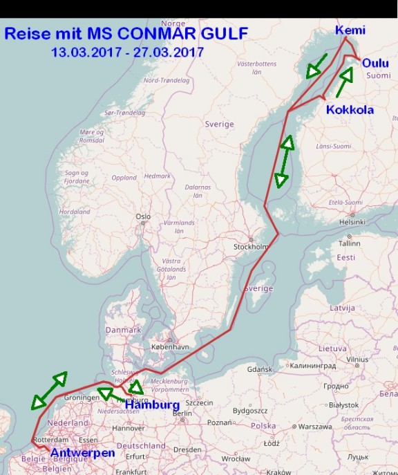 Hamburg -> Antwerpen -> Nord-Ostsee-Kanal -> Kokkola -> Oulu -> Kemi -> NOK -> Hamburg.