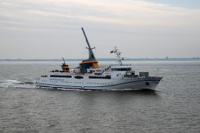 Um 10:30 fahren wir an Cuxhaven vorbei, wo uns Eckhard Reeh von der Alten Liebe aus verabschiedet. Leider ist die Entfernung zu groß und die Sicht zu schlecht, so dass ich ihn nicht erkennen kann. In Höhe der Kugelbake kommt uns die NEUWERK entgegen, kurz darauf überholt uns das neue mit LNG-Antrieb ausgerüstete Fahrgastschiff HELGOLAND.