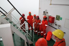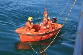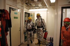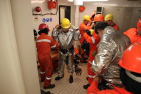 Treffpunkt ist natürlich – wie bei einem echten Notfall - der Sammelpunkt auf dem B-Deck (Musterstation). Alle Mann (auch die Passagiere!) müssen ins Freifallrettungsboot. Anschließend heißt es „Feuer im Maschinenraum“. Zwei Mann zwängen sich in Hitzeschutzanzüge und bewaffnen sich mit Handfeuerlöschern.