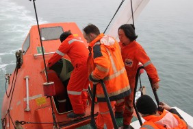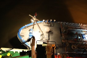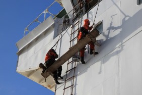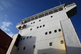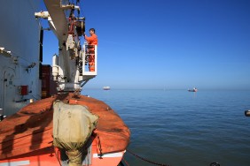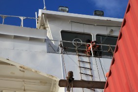 Nach dem Frühstück kommt die Information, dass sich das Einlaufen nach Antwerpen um einen weiteren Tag verzögern wird. Schon früh am Morgen setzt die Crew ihre „Malerarbeiten“ fort, jetzt ist die Vorderfront der Aufbauten an der Reihe. Da die Stellplätze vor dem Aufbau frei sind, bietet sich hierzu eine gute Gelegenheit. Gut gesichert auf einem Bootsmannsstuhl werden Roststellen bearbeitet und dann neu gestrichen.
