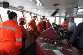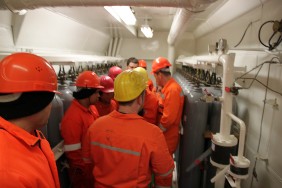 Im CO2-Flaschenraum erläutert der Chief Funktionen und Vorgehensweise. Ein Blick in die Vorpieck schließt die Übung ab. Auf der Brücke erfolgt dann noch vom Kapitän eine Zusammenfassung.