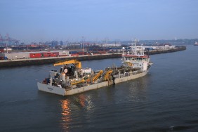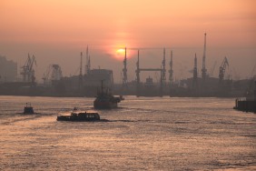 Der Kapitän wendet das Schiff im Köhlbrand, wir passieren den Saugbagger TACCOLA, fahren unter der Köhlbrandbrücke hindurch und verlassen den Hamburger Hafen bei einem wunderschönen Tagesanbruch.