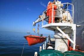 Der Chief nutzt die Liegezeit zur Überprüfung des Boots-Davids. Um uns herum haben diverse weitere Schiffe ihre Warteposition eingenommen. Nach der Coffeetime (15:00 Uhr) ist bei frühsommerlichen 13°C ein „Lifeboatdrill“ angesetzt.