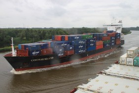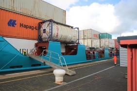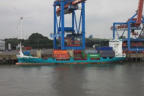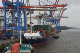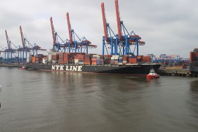 Bereits um 11:00 Uhr heißt es zum ersten Mal „Leinen los“. Wir verholen zum CTA (Container-Terminal-Altenwerder) und passieren die Köhlbrandbrücke. Gleich als erstes Schiff am CTA entdecke ich die RAGNA (baugleiches Schwesterschiff der DORNBUSCH), auf der ich heute auch hätte einsteigen können.