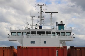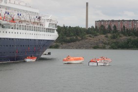 Der Rückweg ist ebenso unproblematisch. Ich habe weder eine Passagierliste noch den Reisepass dabei, habe dieses auch schon vor 2 Monaten bei der Reise mit der LISA nicht gebraucht. Ich entdecke ein großes Tor im Zaun des Containerterminals und steure darauf zu. Kaum bin ich dort angekommen, hält ein Container-LKW und öffnet das unbesetzte Tor. Auf meine Bitte nimmt der Fahrer mich mit. Ein PKW der Security setzt mich dann direkt an der Gangway ab – perfekter Service ohne Formalitäten. Von Bord kann ich dann noch eine Bootsübung der SAGA SAPPHIRE beobachten.