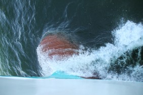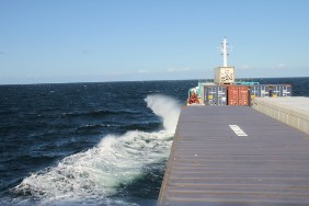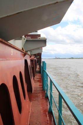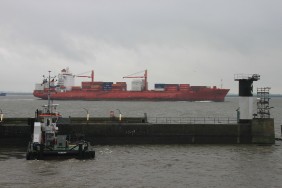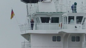 Der Wind hat erheblich nachgelassen, es steht nur noch eine Restdünung. Um 11:00 Uhr kommt der Lotse an Bord, die Besatzung bereitet sich auf das Anlegemanöver vor. Gekonnt wendet der Kapitän das Schiff auf dem schmalen „Helge A“ und legt an der Pier an.
