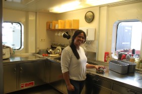 Um 14:00 Uhr geht es auf die Reise. Schon auf der Elbe begegnen uns einige interessante Schiffe. Ich mache einen ersten Rundgang übers Schiff. Werfe auch einen Blick in die Küche, wo mir unsere Köchin Mechelle entgegenlacht.