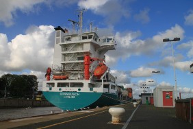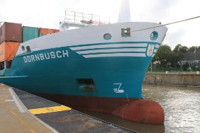 Ich spare mir den Umweg entlang der Straße, überquere einen Firmenparkplatz und bin schon nach wenigen hundert Metern am Kopfende des Hafenbeckens. Dort ist auch die Haltestelle mit dem Ticketverkauf für den Linienbus Nr. 76, der mich in 15 Minuten in die Innenstadt bringen könnte. Ich zögere einen Moment, bleibe dann aber doch im Hafen. Unmittelbar entlang der Kaimauer spaziere ich fast bis zu dem Kreuzfahrer, dort allerdings ist der Kaibereich durch einen hohen Zaun abgesperrt. Ich habe aber einen unversperrten Blick über das Hafenbecken auf die DORNBUSCH.