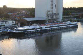 Im Nord-Ostsee-Kanal müssen wir aber schon in der Weiche Kudensee einen längeren Stopp einlegen. Dort kommt uns dann u. a. auch die HANNI entgegen. In Hochdonn hat das Flusskreuzfahrtschiff SANSSOUCI festgemacht und dient als Hotelschiff für die gut betuchten Gäste des „Wacken-Open-Air“. In der Weiche Dückerswisch begegnet uns der Kreuzfahrer INSIGNIA.