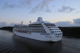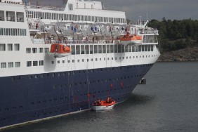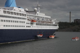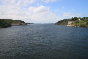 Es ist 03:00 Uhr, ich werde wach und stelle fest, dass die Hauptmaschine schon läuft. Aus dem Kabinenfenster sehe ich gerade noch das Lotsenboot davonfahren. Bei aufgehender Sonne fahren wir durch den zauberhaften Schärengarten, vorbei an der Festung Frederiksborg, vielen wunderschönen Häusern auf kleinen Inseln und nicht so recht in die Landschaft passende Neubauten. Um 06:30 Uhr laufen wir in Stockholms Frihamn ein und machen gegenüber der SAGA SAPPHIRE fest. Bis 1999 hieß sie noch MS EUROPA, danach hat sie mehrfach den Namen gewechselt.