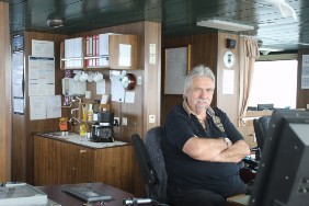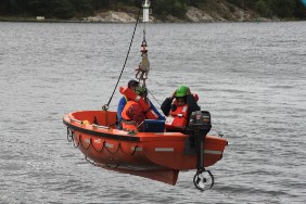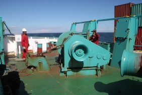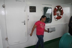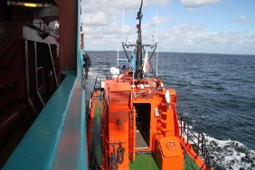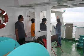Den Vormittag verbringe ich fast durchgehend auf der Brücke bei sehr netten und interessanten Gesprächen mit dem Kapitän. Die Routineinspektion mit Testlauf des Motors des Rettungsbootes durch Öler Edwin lasse ich mir aber nicht entgehen.