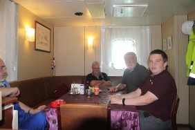An Backbordseite leuchten die weißen Kreidefelsen von Mön. Nach dem Essen (Bohnensuppe, es ist Sonnabend: traditionell Eintopftag) ein gemütlicher Mittagsplausch ohne Verständigungsprobleme in der Offiziersmesse (alle 4 sprechen deutsch!).
