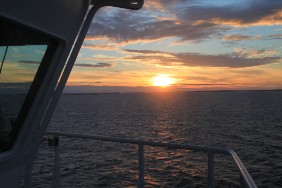 Den Rest des Abends verbringe ich wieder auf der Brücke. Bei schönstem Sonnenuntergang zieht am Horizont die ISABELLE vorbei, eine der Großfähren zwischen Stockholm und Finnland.