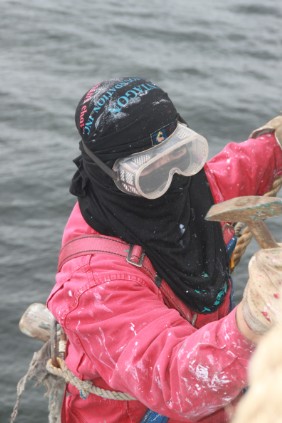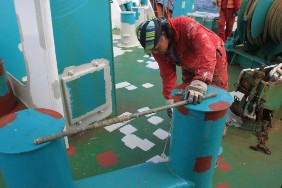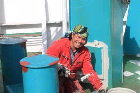 Das herrliche Wetter nutzt die Besatzung, um mit Hingabe und viel Farbe sich bildende Roststellen zu beseitigen. Der Bootsmann und Edwin der Öler reparieren die Geländerstützen der Gangway.