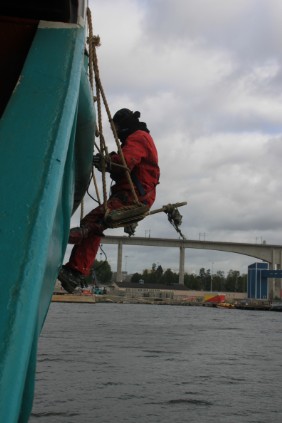 Im Internet hatte ich nichts Interessantes anzusehen in Södertälje gefunden. Mein Entschluss, im Hafen zu bleiben, steht daher fest. Das schöne Wetter -trotz einiger dunkler Wolken bleibt es trocken- nutzt die Crew hier im Hafen von Außenbordseite auch etwas gegen den allgegenwärtigen Rostfraß zu tun.