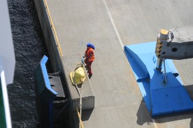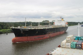 Ich wundere mich, dass kein Lotse an Bord ist. Auch beim Verholen war mir dieses bereits aufgefallen. Der Kapitän klärt mich auf: Er hat aufgrund der Abmessungen des Schiffes und abgelegter Prüfungen eine „Lotsenbefreiung“ für den Hafen und die Elbe. Nur in Brunsbüttel kommt dann um 18:00 Uhr der Lotse an Bord, verlässt uns aber schon wieder in der Schleuse. Von da an begleiten uns der Kanallotse und ein Kanalsteurer. Wir liegen bei schönstem Wetter in der großen Nordschleuse. Ich kann das Schiff kurzzeitig verlassen und ein paar Fotos machen.