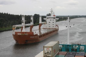 Kurz vor der Autobahnbrücke Rade kommt uns die NORDIC HAMBURG entgegen, in der Weiche Schülp dann ein Konvoi mit der HELGAFELL, dem Tanker HIGH EFFICIENCY und der ERASMUSGRACHT. Nur wenig später müssen wir in der Weiche Fischerhütte erneut den Gegenverkehr (CONMAR ISLAND und NORDIC PHILIP) passieren lassen.