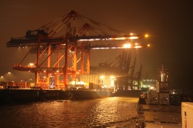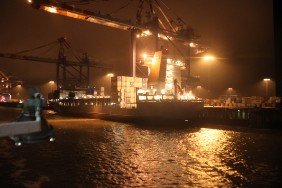 Cuxhaven ist in der Dämmerung –es ist schon 19:00 Uhr- und im aufkommenden Nebel kaum zu sehen. Um 23:00 Uhr leuchtet es am Horizont. Die hell erleuchtete Stromkaje von Bremerhaven kommt in Sicht. Dicht vorbei an 2 Schiffen der Maersk Line und der THETIS D steuern wir unseren Liegeplatz an.