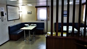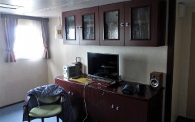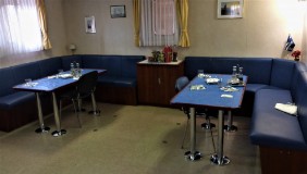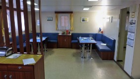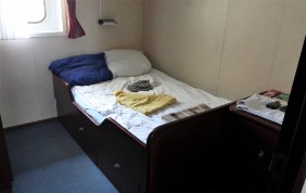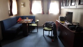 Meine Kammer lag auf dem 5. Deck, direkt unter der Brücke und bestand aus einem großzügigen Wohnraum mit Sitzecke, Sideboard mit integriertem Kühlfach sowie einem separaten kleineren Schlafraum, ausgestattet mit breitem Bett und Schrank sowie einer Nasszelle. Ausblick nach vorne und zur Backbordseite waren frei, vom Schlafraum war der Ausblick nach achtern frei.