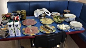 Zu jeder Mahlzeit gibt es ein warmes Gericht, auch zum Frühstück, z. B. Pfannkuchen, Spiegeleier mit Speck, Würstchen, Rührei, Leberkäs mit Spiegelei, etc. Meine Favoriten waren Spiegeleier mit oder ohne Speck, Rührei, Omelette und natürlich wenn es sie gab: Pan-Cakes mit und ohne Obst.