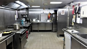Die Kombüse liegt zwischen der Offiziersmesse und der Crew-Messe und hat eine Durchreiche zur jeweiligen Messe. Der Koch hat den arbeitsintensivsten Job an Bord. Er bereitet täglich für 16 Personen 3 Mahlzeiten vor, europäisches und asiatisches Essen.