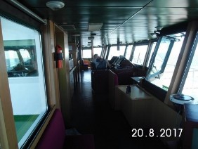 Dann habe ich mich in meiner Kammer auf dem B-Deck eingerichtet - das ist der „2.Stock“ - und erst mal die klatschnassen Klamotten gewechselt. Die Schuhe waren völlig aufgeweicht. Aber an Bord trägt man indoor sowieso nur Latschen. An Deck auf jeden Fall festes Schuhwerk. Es sei denn, man will nur mal kurz „vor die Tür“.