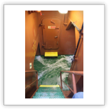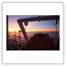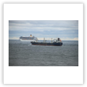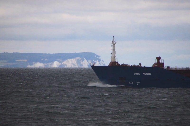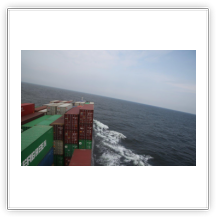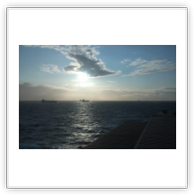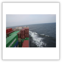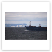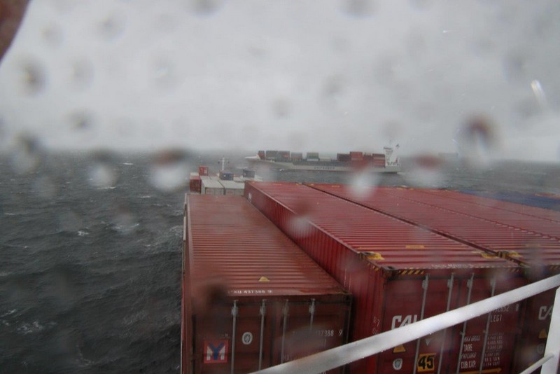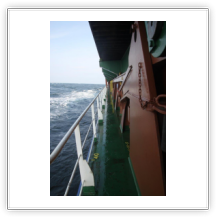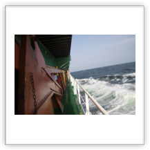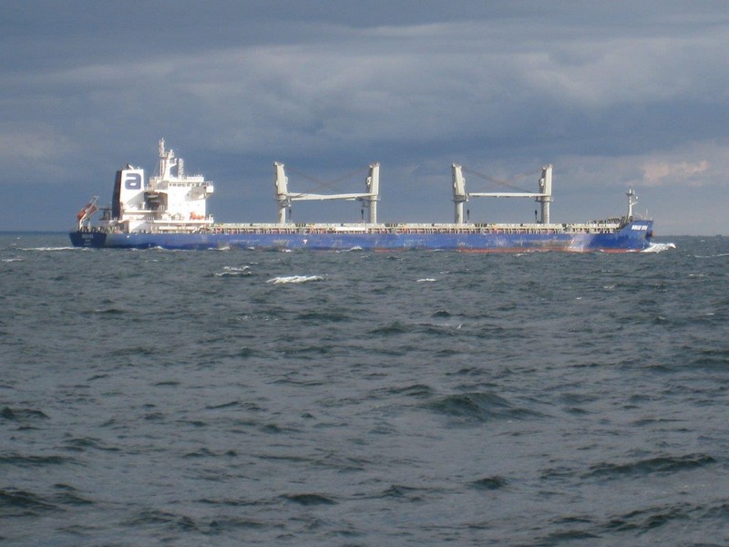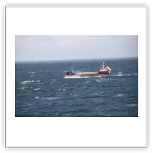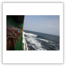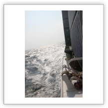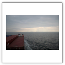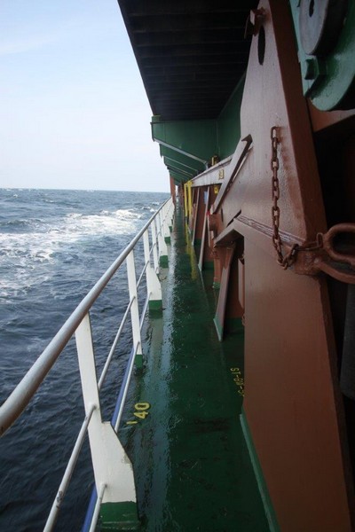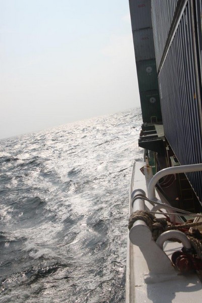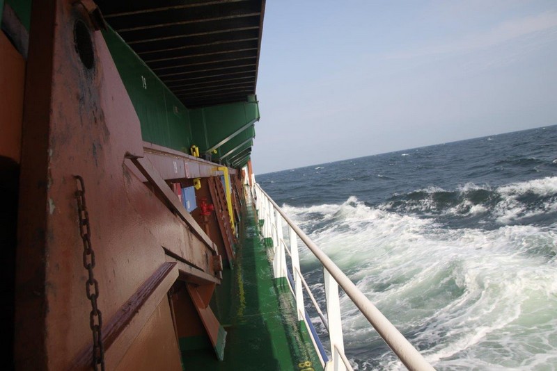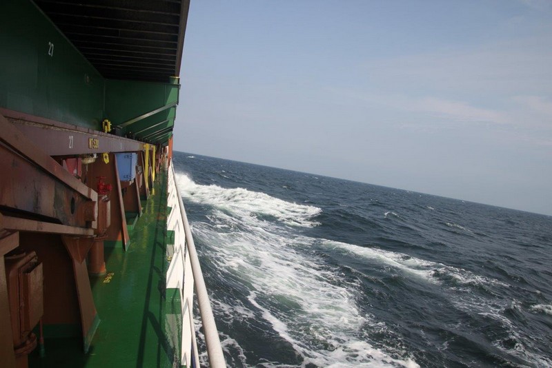 Der Wind hat wie angekündigt auf 17 - 18 m/s –das entspricht Windstärke 7– aufgefrischt und schiebt uns mit 15 kn westwärts. Die von achtern anrollenden Wellen mit leichten Schaumkämmen (Seegang 6) bringen das Schiff zum Rollen, es kränkt bis zu 11°, was allerdings nicht unangenehm ist. Wir überholen einige andere Frachter, auch die bewegen sich teilweise heftig in den Wellen.