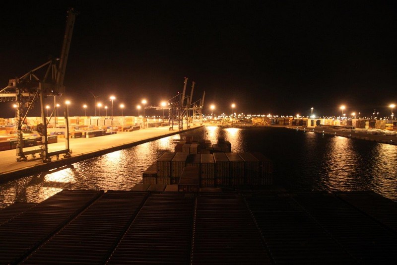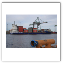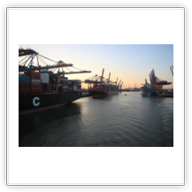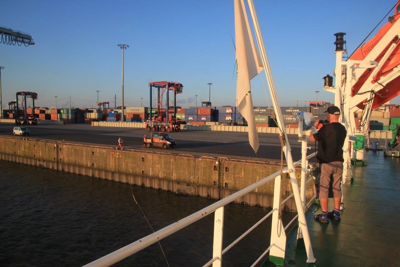 Bei schönstem Sonnenschein genieße ich den Blick auf die Elbe und verfolge mit den Augen die vorüberziehenden Schiffe. Um 23:00 verholen wir zum Eurogate in den Waltershofer Hafen. Dabei erlebe ich Erstaunliches. Der Kapitän steuert das Schiff souverän rückwärts (!) vom bisherigen Liegeplatz an der Elbe bis zum neuen Liegeplatz am Eurogate. Dabei müssen wir bei der herrschenden Dunkelheit zwischen einigen Giganten hindurch, das ist zwar eng, aber es passt. Auf der Seite des CTB liegen die 400 m lange AL MURAYKH und die 369 m lange AL MURABBA, beim Eurogate wird die 275 m lange MSC KATYAYNI gerade noch von 2 Schleppern bei ihrem Anlegemanöver assistiert. Die 398 m lange EVELYN MAERSK hat hinter uns festgemacht. Wir mit unserem 151 m Länge kommen uns da fast wie ein Spielzeugschiff vor. Ich bin begeistert von den „Fahrkünsten“ des Kapitäns.