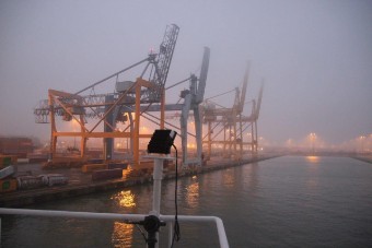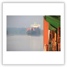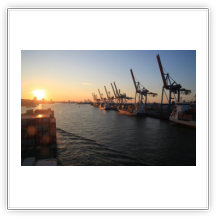Pünktlich –wie gestern Abend schon angekündigt– wird um 06:30 die Hauptmaschine gestartet, und wir machen uns auf den Weg zum nächsten Liegeplatz am CTT (Container-Terminal-Tollerort), natürlich wieder ohne Schlepperhilfe. Bei Sonnenaufgang passieren wir noch einmal die Riesenpötte. Jetzt bei Tageslicht wirken die aber schon nicht mehr ganz so gewaltig.