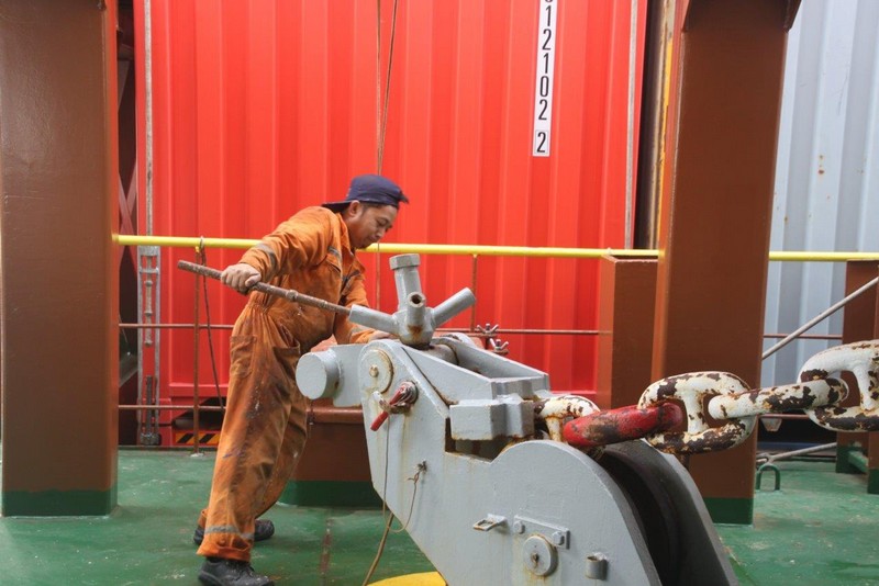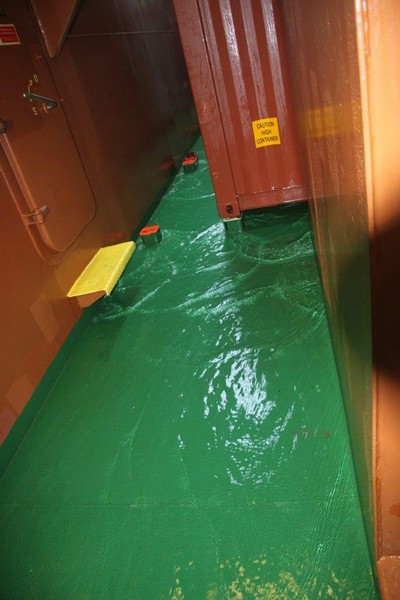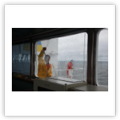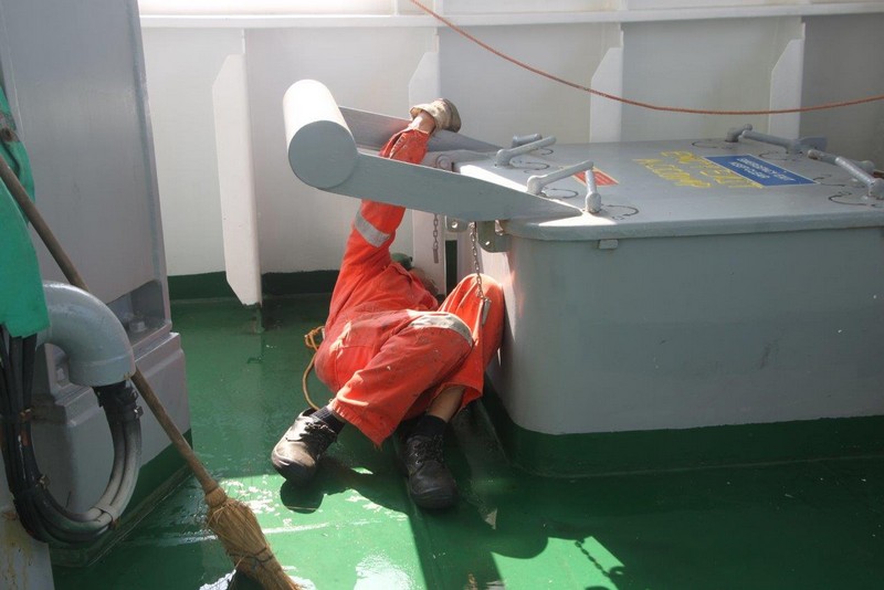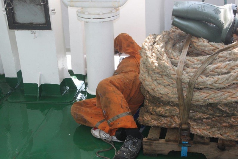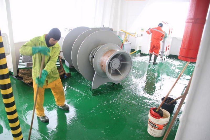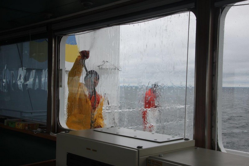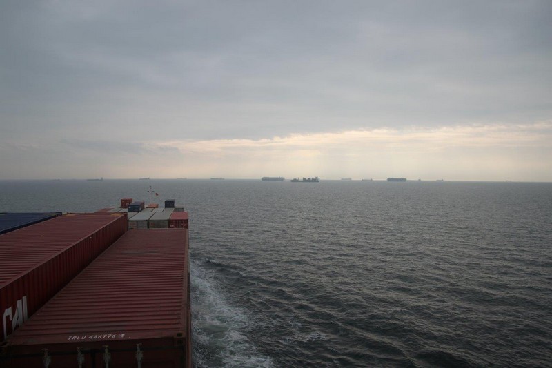 Wir müssen also voraussichtlich nördlich von Wangerooge vor Anker gehen. Der Kapitän verringert unsere Geschwindigkeit auf etwa 9 kn. Das ändert zwar nichts an den zugewiesenen Zeiten in Bremerhaven, der Treibstoffverbrauch allerdings sinkt. Die Crew beschäftigt sich mit Deckwaschen.