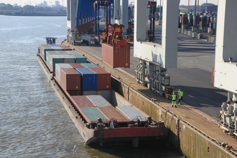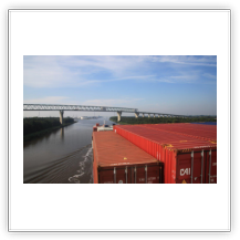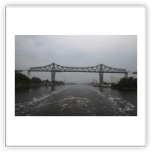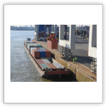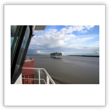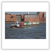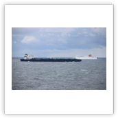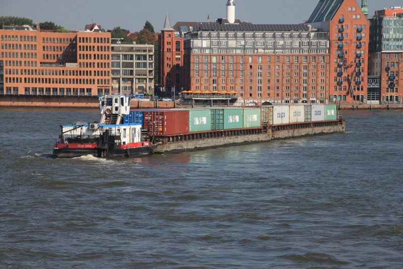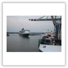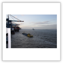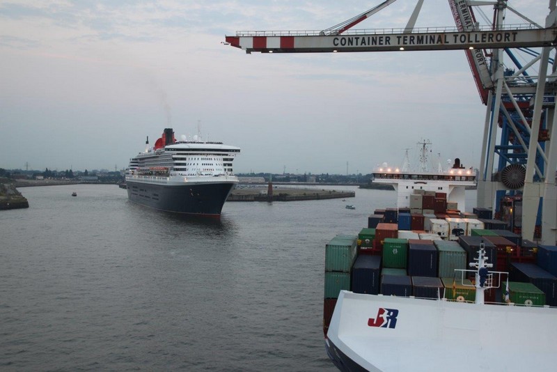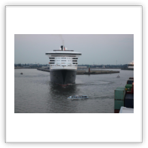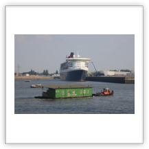 Aus dem Köhlbrand kommt gerade vom CTA (Contaier-Terminal-Altenwerder) der nächste Riese, die NYK EAGLE (364 m), auf ihrer Fahrt nach Antwerpen. Beim Einschwenken in den Vorhafen entdecke ich am Cruise-Terminal Steinwerder die QUEEN MARY 2. Wir drehen und machen am CTT fest. Während wir auf die Beladung warten, werden hinter uns 2 Bargen mit Containern beladen. Kurz darauf setzt sich der Schub-Schlepper SCH 2414 mit den beiden Bargen voraus in Bewegung Richtung Berlin.