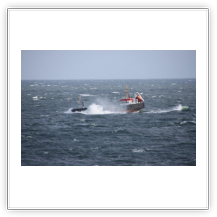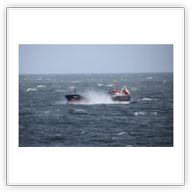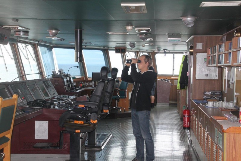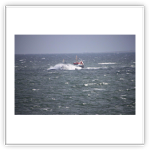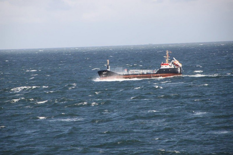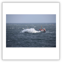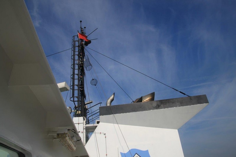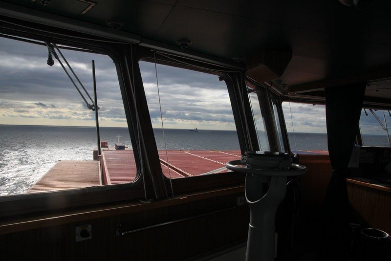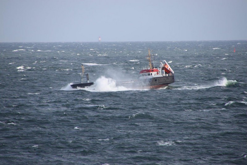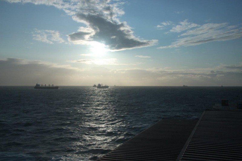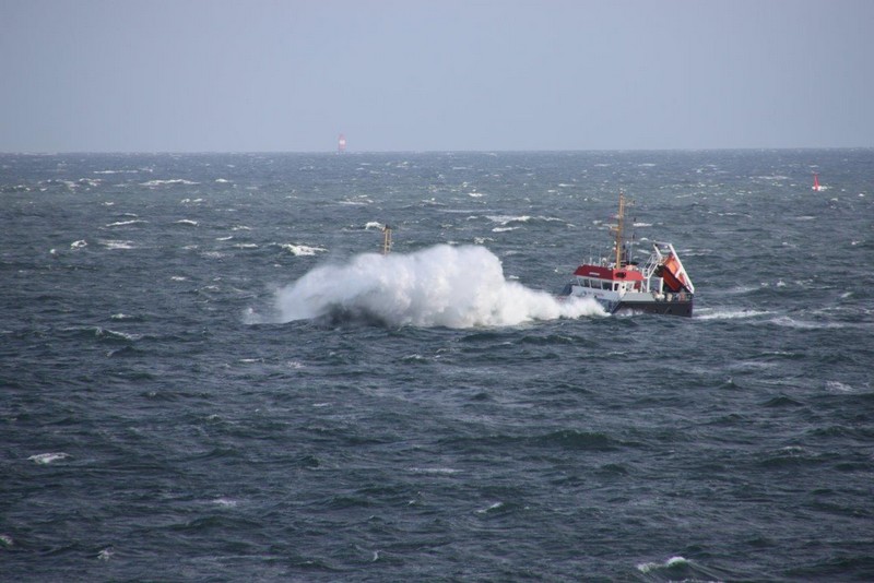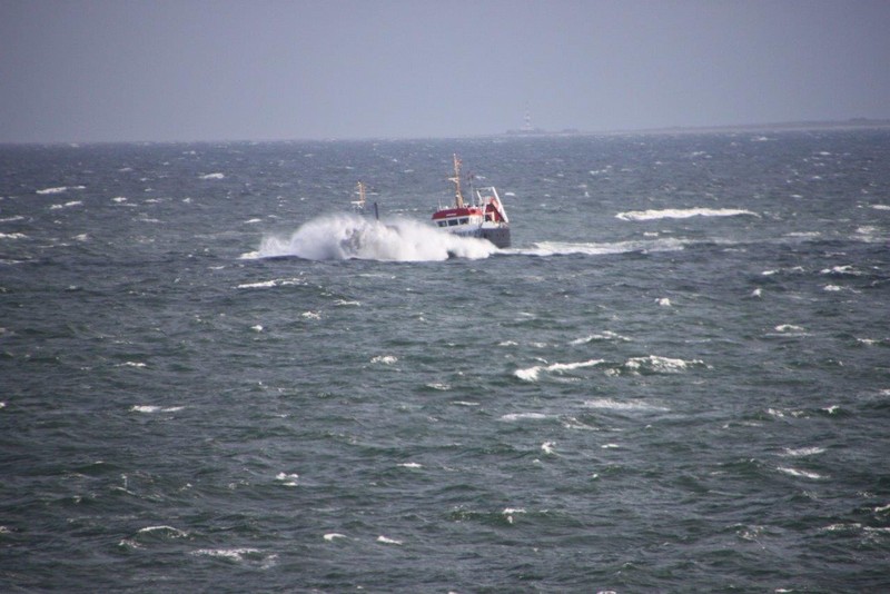 Über Nacht haben einige der wartenden Schiffe ihren Ankerplatz verlassen und sind vermutlich nach Bremerhaven eingelaufen. Für uns heißt es immer noch: warten! Das Wetter ist umgeschlagen. Gestern Abend war es neblig bei 20°C, heute Morgen ist es merklich abgekühlt und es regnet. Der Regen hört zwar schon recht bald wieder auf, dafür frischt der Wind im Laufe des Nachmittags erheblich bis auf Windstärke 8 bis 9 auf. Es bildet sich erstaunlich schnell eine ansehnliche Dünung mit Wellenhöhen bis zu 5 m die kleineren Schiffen erheblich zu schaffen macht.