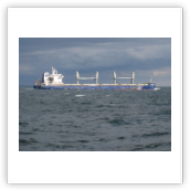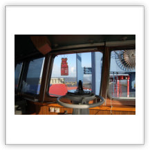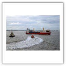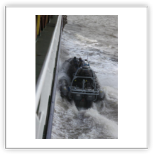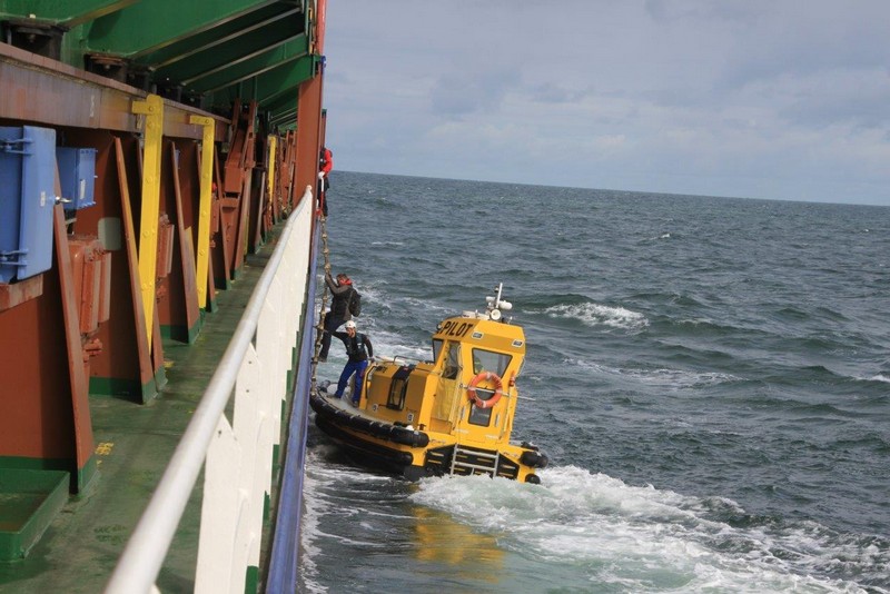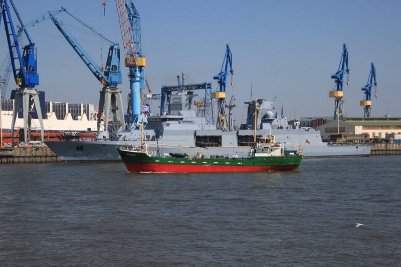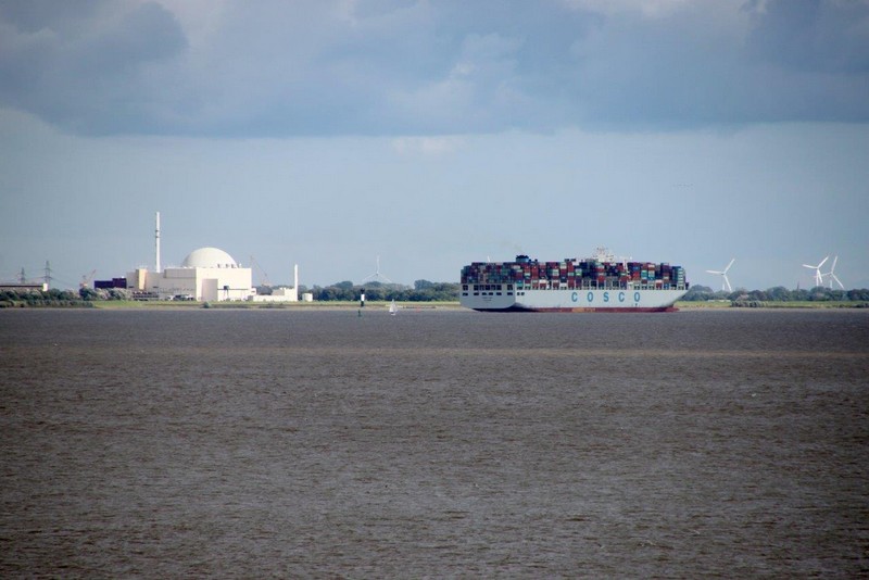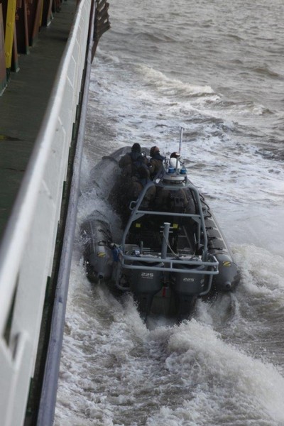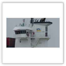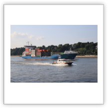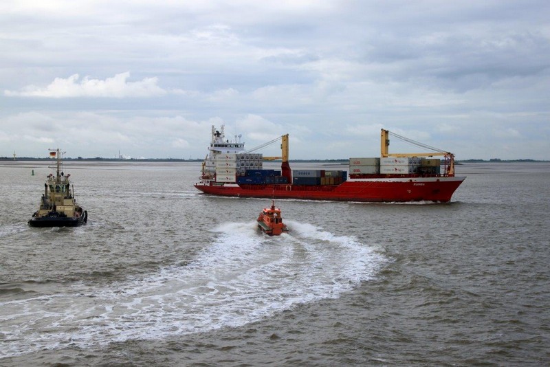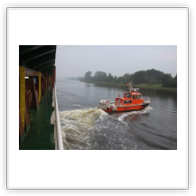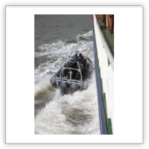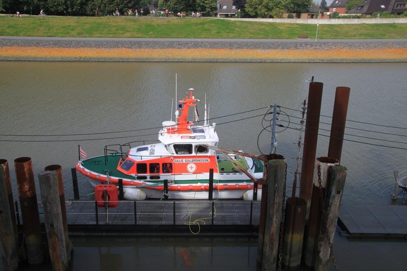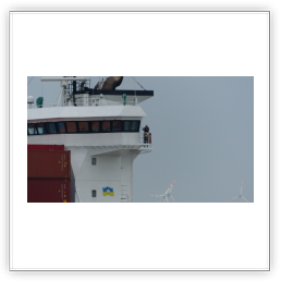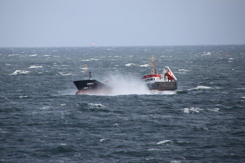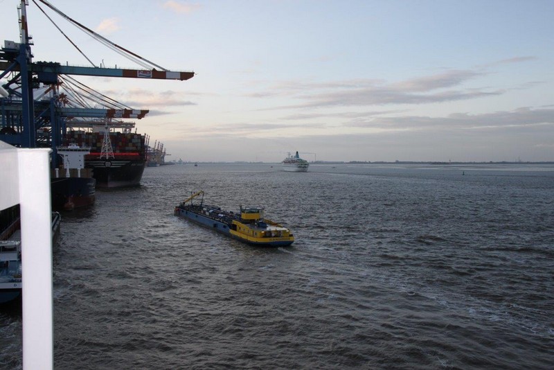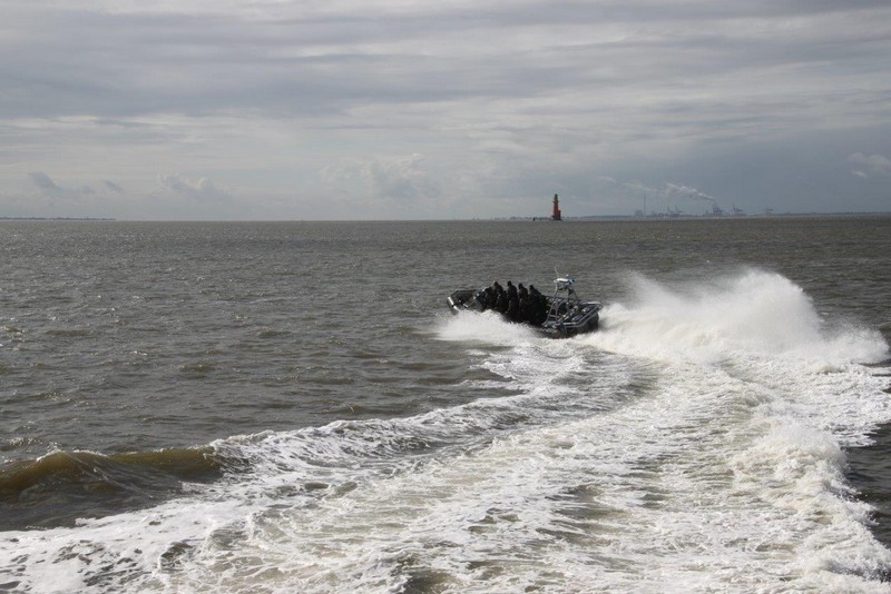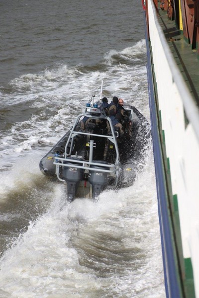 Um 10:00 sind die Ladearbeiten abgeschlossen, und wir machen uns auf den letzten Abschnitt der Reise. Die Stauerei holt mit ihrem „Einhorn“ wieder die Gangway ab, der Schlepper BUGSIER 17 assistiert uns beim Ablegemanöver wegen des auflandigen Windes. Vor uns läuft die RUMBA auf ihrer Reise in die norwegischen Fjorde aus. Bald passieren wir den kleinen Badeort Wremen. Nach fast einer Stunde rasen plötzlich 8 schwarz vermummte Gestalten mit einem Schlauchboot auf uns zu. Der erste Gedanke ist ein Piratenüberfall, das Gegenteil ist jedoch der Fall. Die Bundespolizei hält –natürlich mit vorheriger Rücksprache mit dem Kapitän– eine Übung ab. Mehrfach werden wir auf Steuerbord- wie auch auf Backbordseite von den Maskierten „angegriffen“.