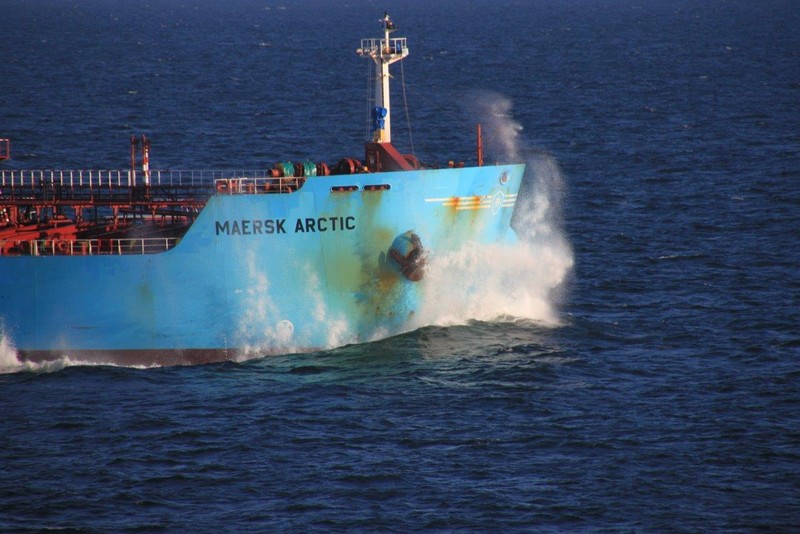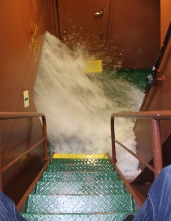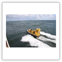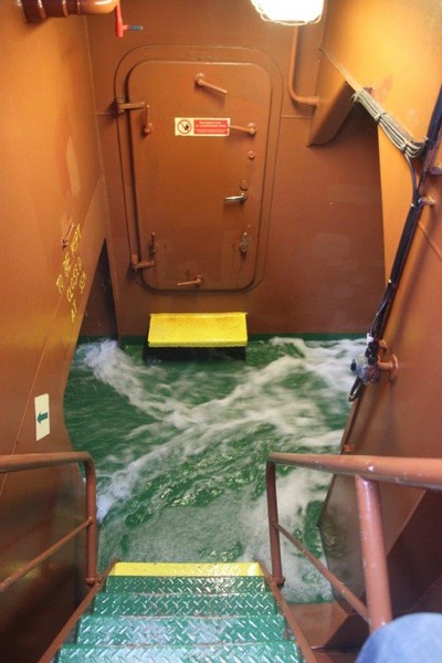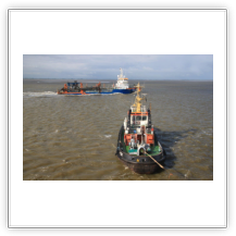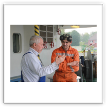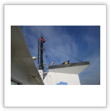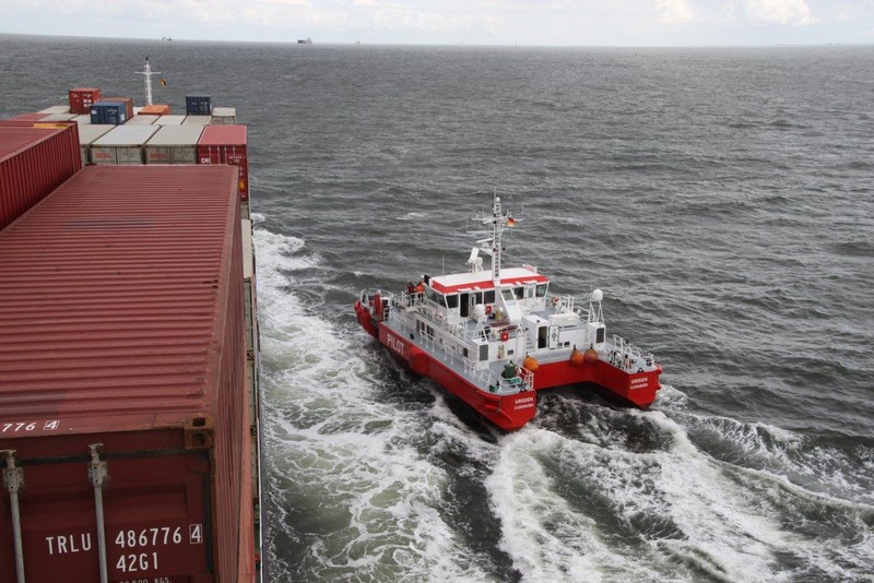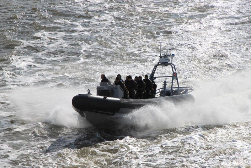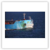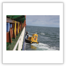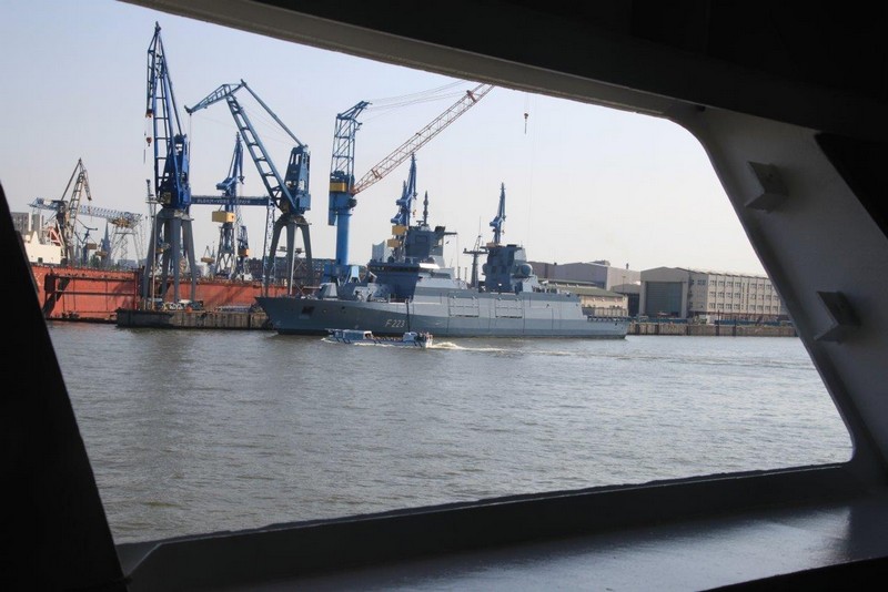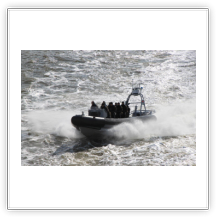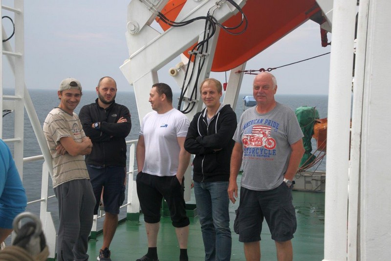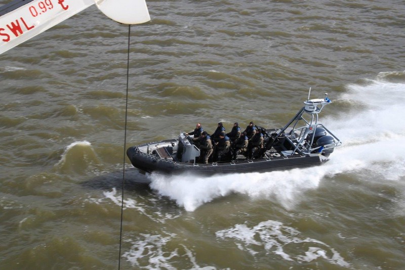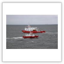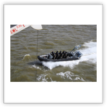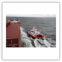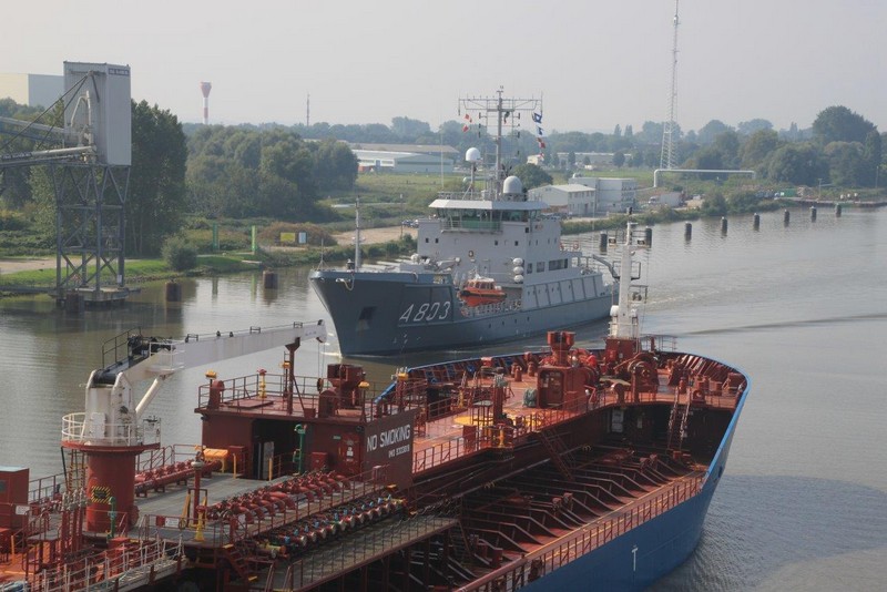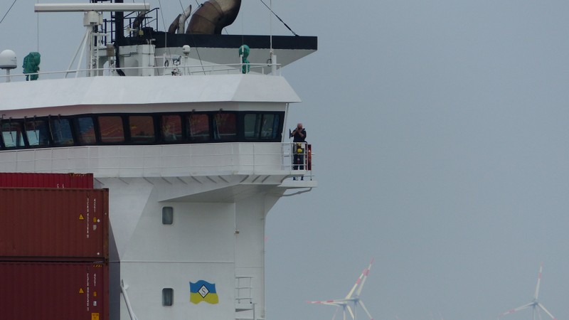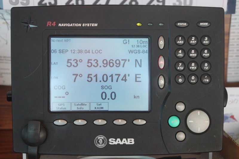 Um 10:00 sind die Ladearbeiten abgeschlossen, und wir machen uns auf den letzten Abschnitt der Reise. Die Stauerei holt mit ihrem „Einhorn“ wieder die Gangway ab, der Schlepper BUGSIER 17 assistiert uns beim Ablegemanöver wegen des auflandigen Windes. Vor uns läuft die RUMBA auf ihrer Reise in die norwegischen Fjorde aus. Bald passieren wir den kleinen Badeort Wremen. Nach fast einer Stunde rasen plötzlich 8 schwarz vermummte Gestalten mit einem Schlauchboot auf uns zu. Der erste Gedanke ist ein Piratenüberfall, das Gegenteil ist jedoch der Fall. Die Bundespolizei hält –natürlich mit vorheriger Rücksprache mit dem Kapitän– eine Übung ab. Mehrfach werden wir auf Steuerbord- wie auch auf Backbordseite von den Maskierten „angegriffen“.