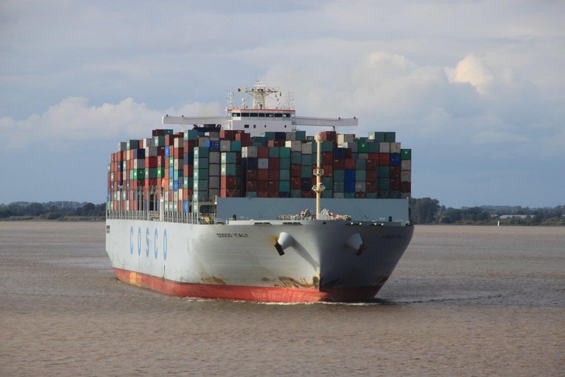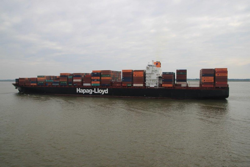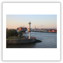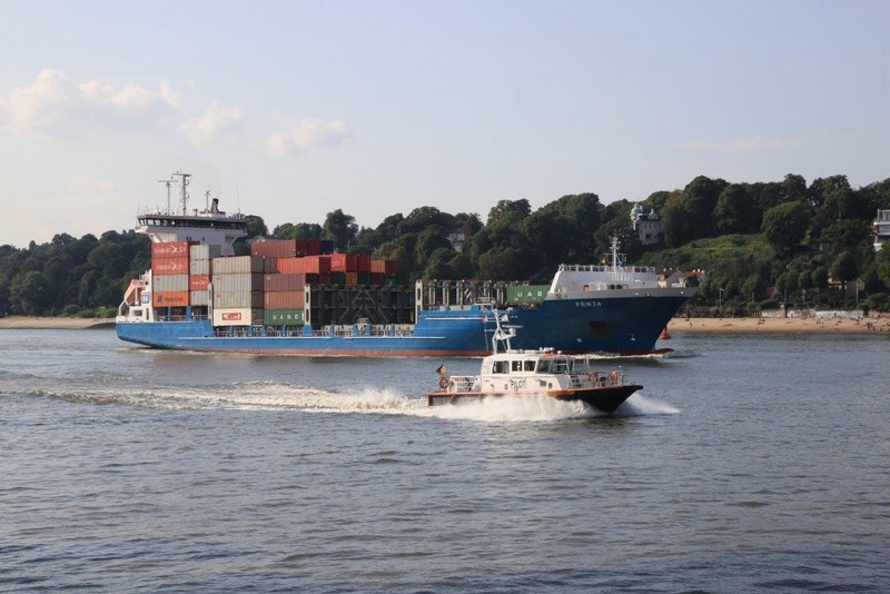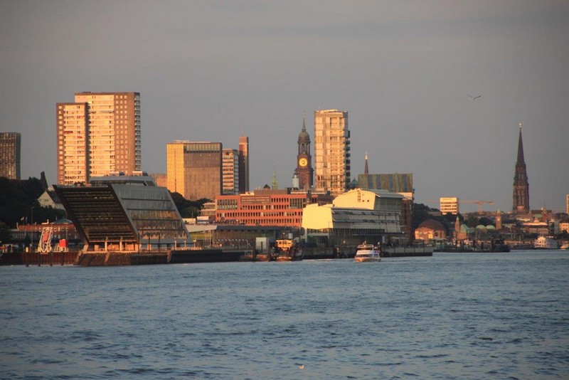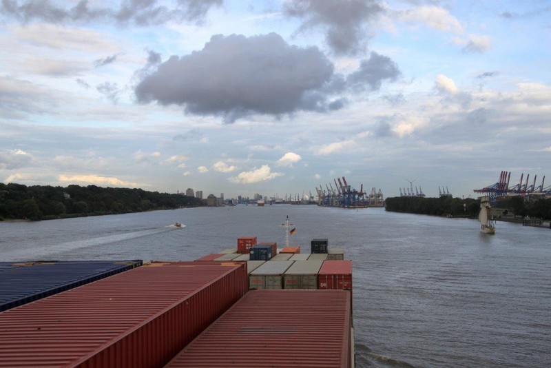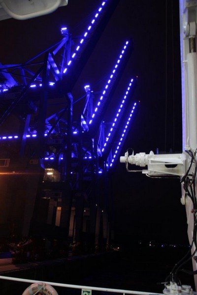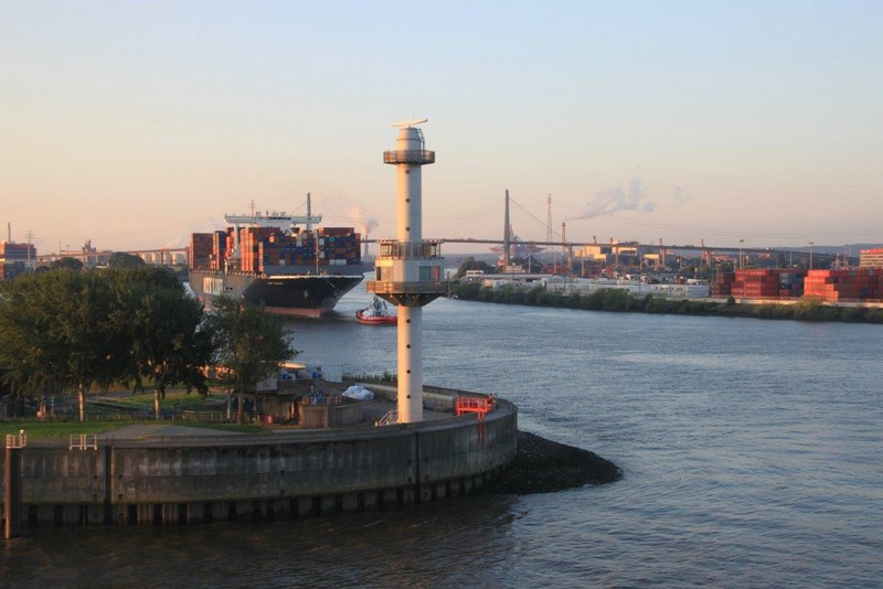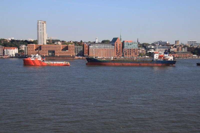 In Höhe der Reede Neue Weser Nord verlässt uns der Weserlotse. Anstatt von dem Lotsentender WANGEROOG wird er von dem kleinen, nicht minder schnellen Boot HUNTE zum Lotsenmutterschiff gebracht. Nach erneutem Lotsenwechsel führt uns der Elblotse vorbei an Glückstadt bis nach Hamburg. Auf der Elbe in Höhe von Kollmar überholen wir die 366 m lange COSCO ITALY. Um 19:00 sind wir in Hamburg am Athabaskakai fest. Bevor ich jedoch von Bord gehen kann, muss ich noch die Immigration-Prozedur abwarten. Langsam wird es Abend, die Lichter gehen an. Hamburg feiert an diesem Wochenende die Cruise-Days und den BluePort. Viele Gebäude, Schiffe und auch Hafenanlagen leuchten blau, so auch die Containerbrücken. Als dann die Beamten um 21:00 immer noch nicht an Bord sind, entscheidet der Kapitän zu meinen Gunsten. Ich kann mich ohne Prüfung meiner Identität auf den Heimweg machen.