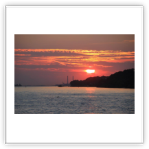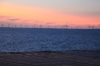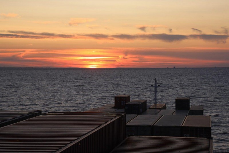 Die geringe Geschwindigkeit hat aber auch für uns positive Erscheinungen. Wir werden von vielen Schiffen überholt, das ergibt eine Menge Fotomotive. Da zwischenzeitlich wieder die Sonne zum Vorschein gekommen ist und der Wind nur noch mit 7 m/s (=4 Bft) bläst, kann man sich gut an Deck aufhalten. Querab von Fehmarn überrascht uns mal wieder ein toller Sonnenuntergang. Die Windräder eines Windparks scheinen zu glühen.