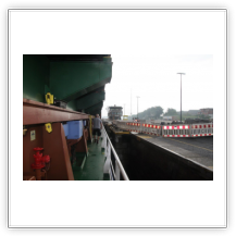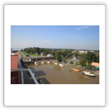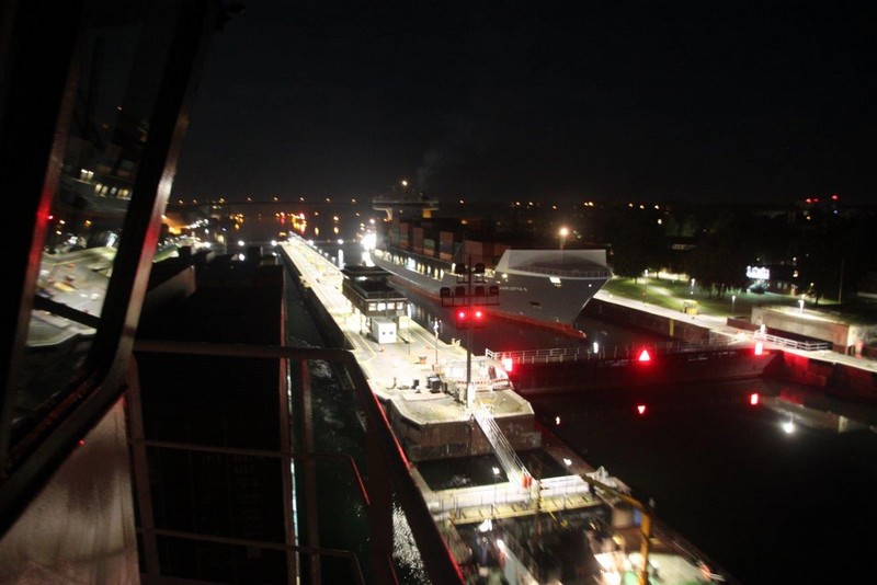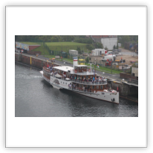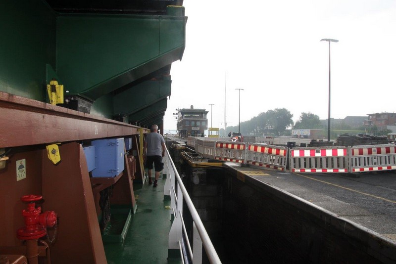 Reger Schiffsverkehr entschädigt uns aber. Foto- und Videokamera laufen sich heiß. Mittags haben wir Brunsbüttel erreicht. Von der Kommandobrücke bietet sich ein ausgezeichneter Einblick in den Ort. Während der Schleusung gehe ich schnell an Land und fotografiere das Schiff von außen. Das Essen hat mir während dessen unser Cookie warm gestellt.