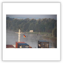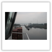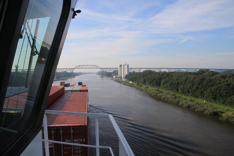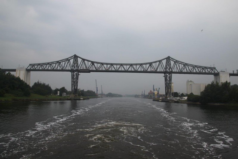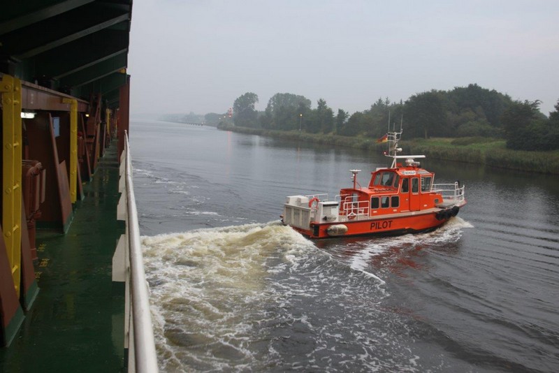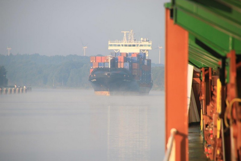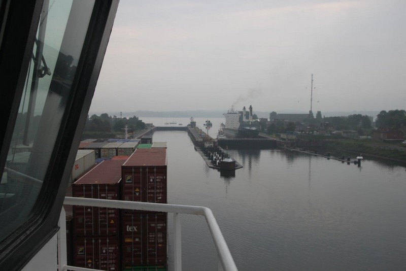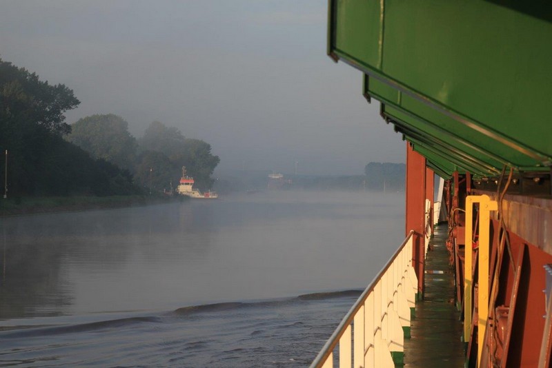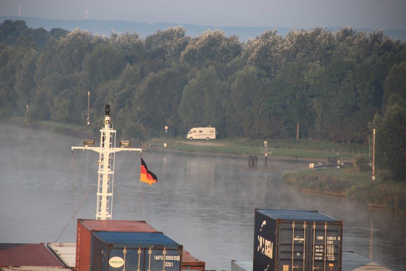 Um 02:00 passieren wir die Schleuse in Kiel-Holtenau. Aufgrund der bestehenden Vorschriften darf im Kanal nur mit einer Geschwindigkeit von 8,5 kn gefahren werden. Als ich um 07:00 aufwache, durchfahren wir gerade im Morgengrauen eine Nebelbank. Wäre ich schnell genug gewesen, hätte es ein paar tolle Fotos geben können. An Deck angekommen, sehe ich die Nebelbank nur noch wie einen Wattebausch über dem Kanal hinter uns liegen. Es bleibt aber neblig, die Sonne lässt sich nur selten blicken.