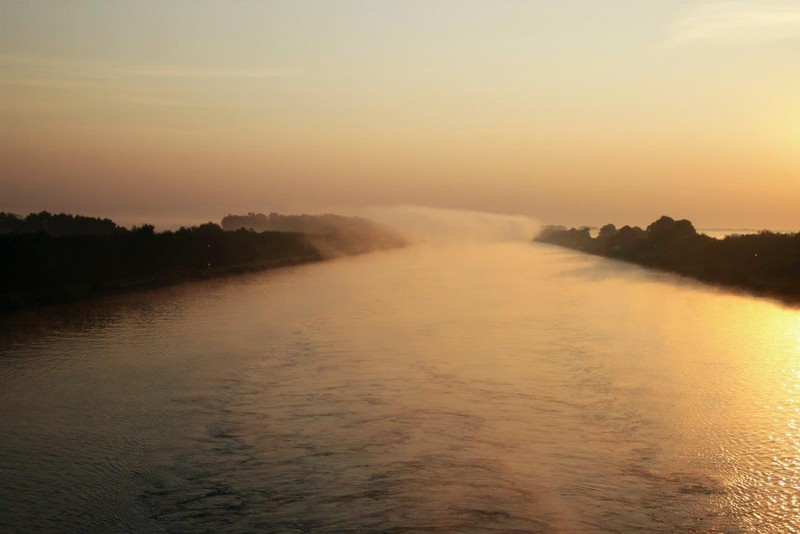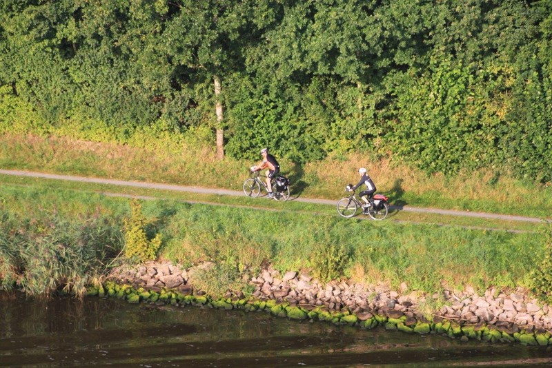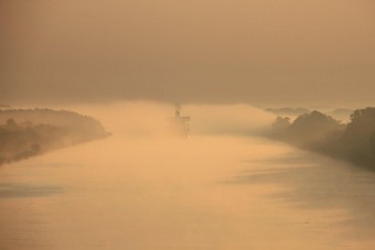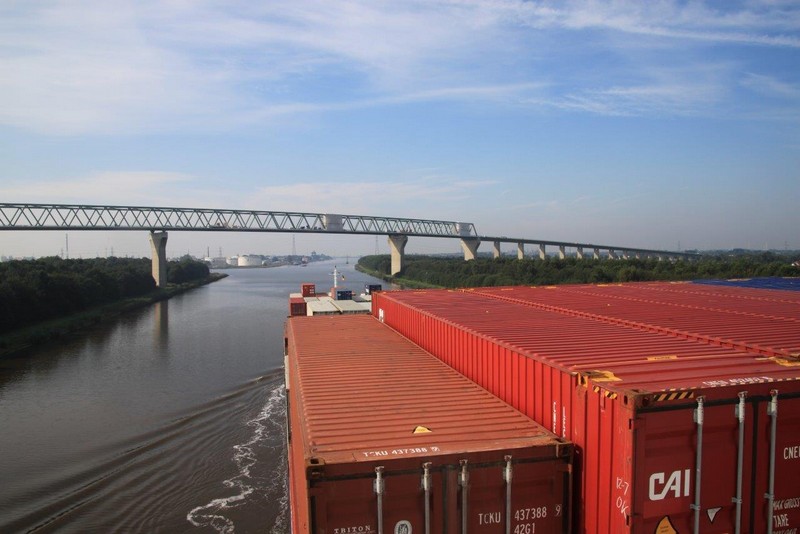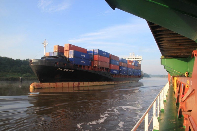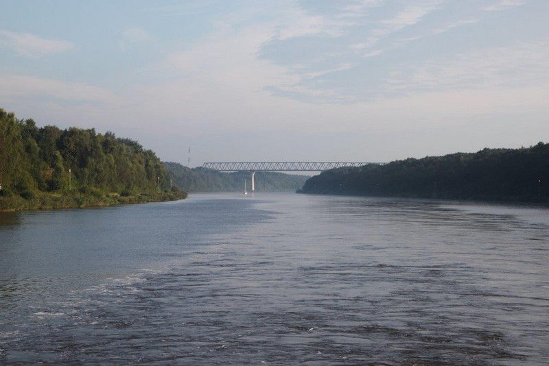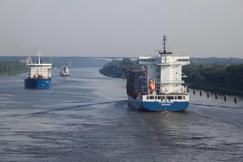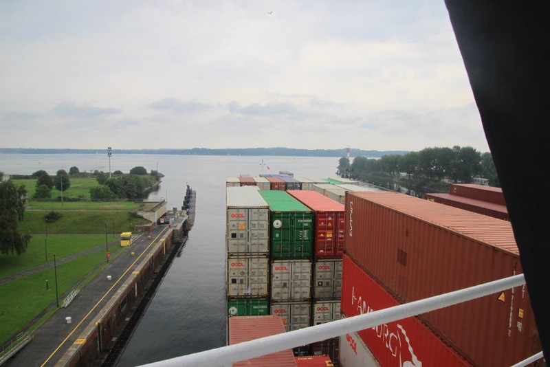 Um 02:00 passieren wir die Schleuse in Kiel-Holtenau. Aufgrund der bestehenden Vorschriften darf im Kanal nur mit einer Geschwindigkeit von 8,5 kn gefahren werden. Als ich um 07:00 aufwache, durchfahren wir gerade im Morgengrauen eine Nebelbank. Wäre ich schnell genug gewesen, hätte es ein paar tolle Fotos geben können. An Deck angekommen, sehe ich die Nebelbank nur noch wie einen Wattebausch über dem Kanal hinter uns liegen. Es bleibt aber neblig, die Sonne lässt sich nur selten blicken.