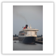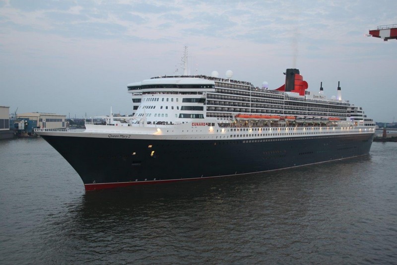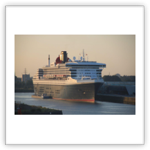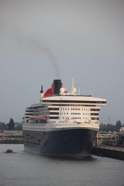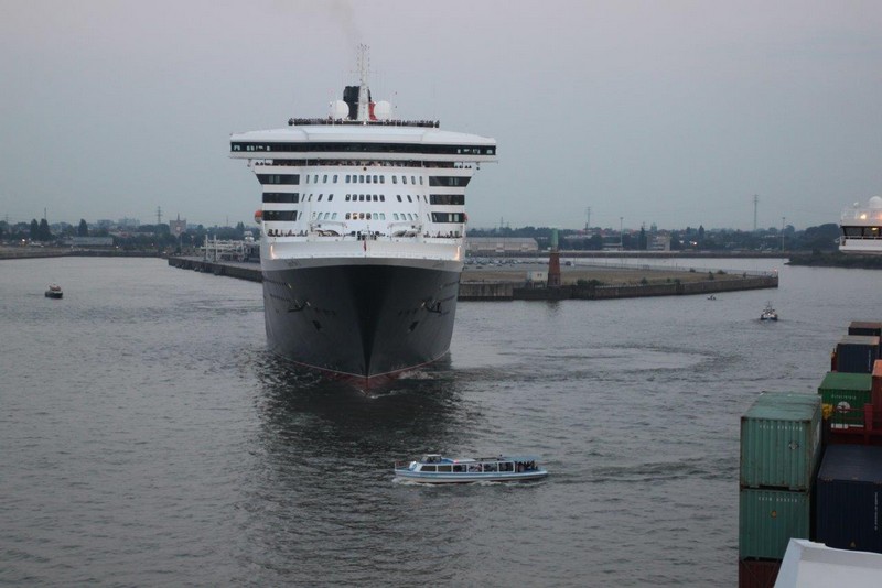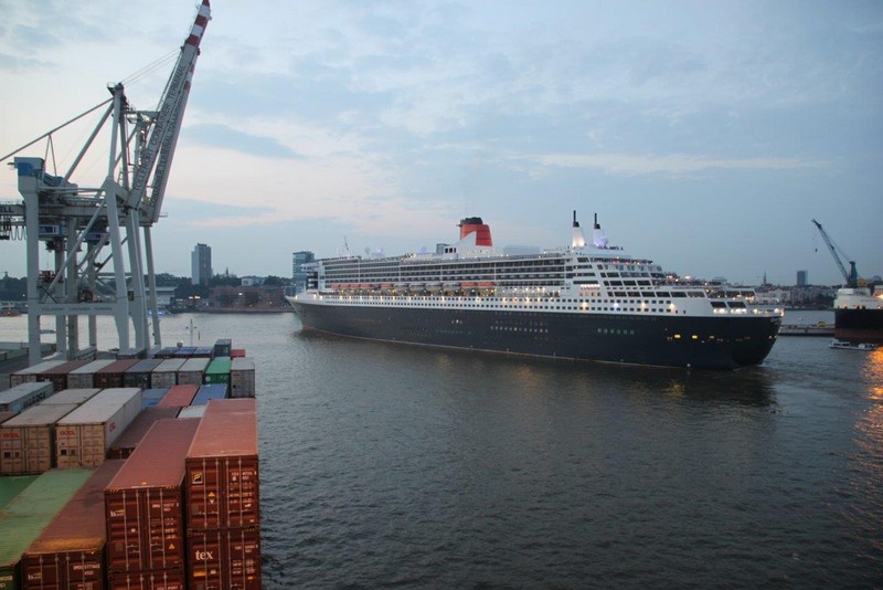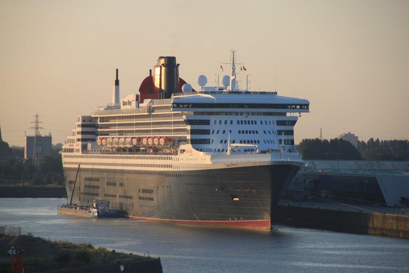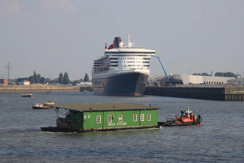 Um 20:00 werden wir von einem gewaltigen Getöse hoch geschreckt. Die QM2 kündigt mit ihrem sonoren aber deshalb nicht weniger lautem Typhon an, dass sie sich nunmehr auf die Reise nach Southampton macht. Langsam gleiten die 345 m Stahl an uns vorbei und entziehen sich schließlich auf der Elbe unseren Blicken. Das Licht hat gerade noch gereicht ein paar Fotos zu schießen.