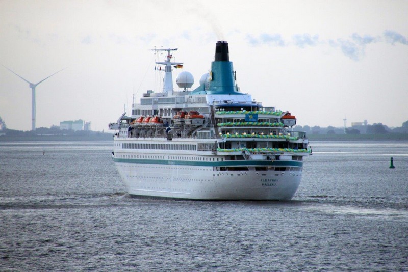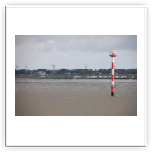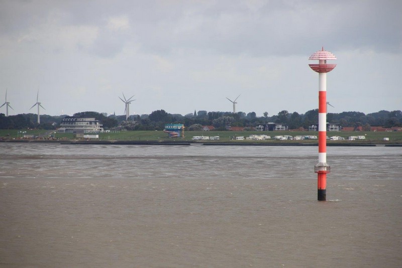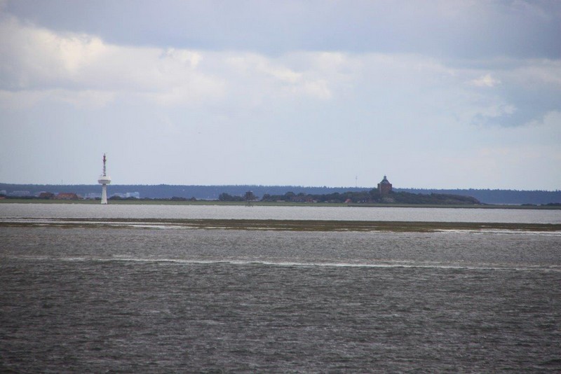 Nach einer ruhigen Fahrt vorbei an Cuxhaven passieren wir dann die zu Hamburg gehörende Inseln Neuwerk und Scharhörn. Sie sind allerdings im Dunst nur schemenhaft zu erkennen. Der Lotse verlässt uns, und um 17:00 sind wir nördlich von Wangerooge auf der „Reede Neue Weser Nord“ und werfen Anker. Gern hätte ich jetzt einen kleinen Ausflug auf die Insel gemacht, aber die Entfernung ist noch so groß, dass man das Eiland bei der z. Zt. herrschenden schlechten Sicht nicht einmal erahnen kann. Ein Shuttle-Service der Kurverwaltung gibt es leider auch nicht.