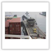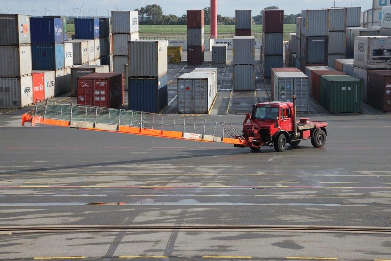 Um 01:00 sind wir fest an der Stromkaje in Bremerhaven. Uns wurde der letzte Liegeplatz am Ende des Containerterminals zugewiesen. Diese letzten Liegeplätze entstanden erst 2008 bei einer Erweiterung des Terminals. Um diese zu schaffen, mussten gewaltige Mengen Erde bewegt werden und die Mündung des Grauwallkanals verlegt werden. Mit den kleinen Ortschaften Weddewarden, Imsum und Wremen mit seinem idyllischen Fischerhafen musste eine Vereinbarung getroffen werden, u. a. da man hier eine Beeinträchtigung der Qualität als Urlaubsort befürchtete. Es entstand mit 4.930 m die längste Stromkaje Europas.