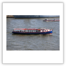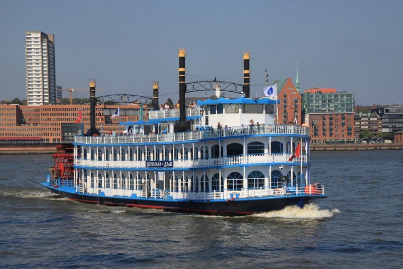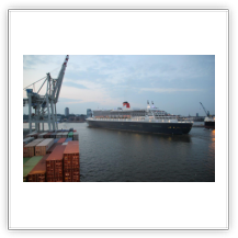 Gegen Mittag beginnen auch bei uns die Beladearbeiten. Nach etwa 2 Stunden ist es damit allerdings schon wieder vorbei. An der Container-Verladebrücke ist ein Hydraulikschlauch geplatzt, nichts geht mehr. Auf dem Wasser allerdings herrscht Hochbetrieb. Eine Hafenrundfahrt nach der anderen kommt, um dann dicht an der QM2 vorbei den Touristen ein paar Märchen aufzutischen. Nicht umsonst nennt man die Hafenrundfahrtkapitäne „he lücht“ (er lügt). Bei traumhaften Sommerwetter genießen wir den Tag. Die Beladung kann nach etwa 2-stündiger Reparatur des Kranes fortgesetzt werden.