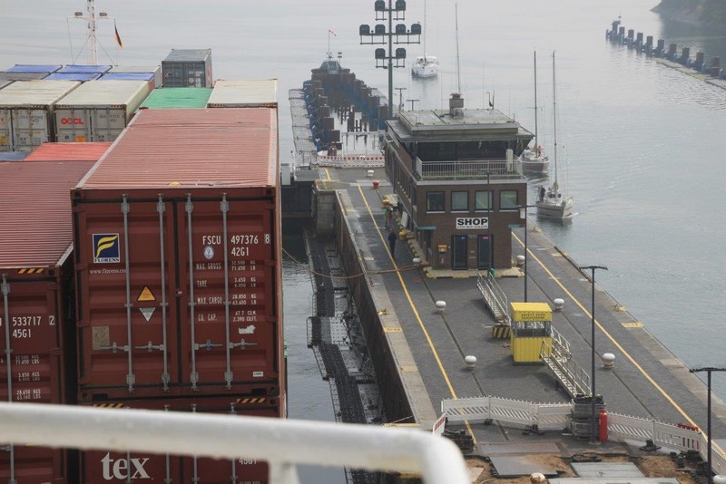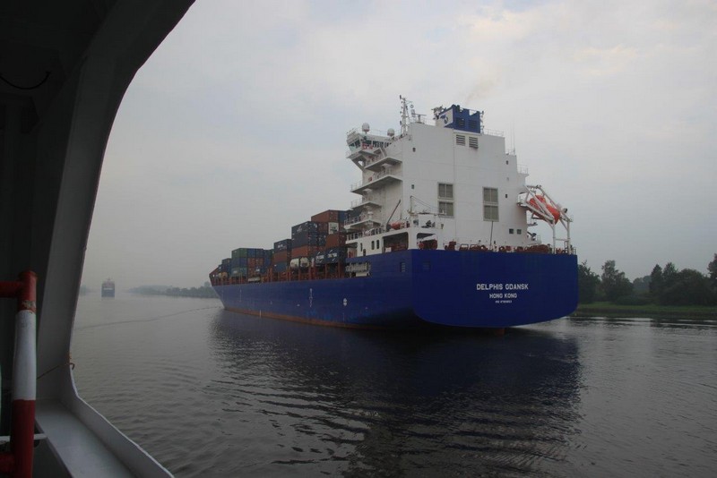 Von den Schleusen in Brunsbüttel habe ich nichts mitbekommen, ich bin erst kurz vor der Lotsenstation Rüsterbergen wieder aufgewacht. In der Weiche Schülp begegnet uns die DELPHIS GDANSK, eines der neuen ganz großen Feederschiffe. Bei diesen muss aufgrund der begrenzten Durchfahrtshöhe der Kanalbrücken sogar der Hauptmast geklappt werden. Bei recht trüben Wetter und etwas Regen geht’s weiter Richtung Kiel-Holtenau. Die Schwebefähre in Rendsburg ist nach wie vor außer Betrieb. Sie war im Januar 2016 bei einem Zusammenstoß mit einem Frachtschiff schwer beschädigt worden. Um 11:00 haben wir die Schleusen in Holtenau erreicht. In der Südschleuse hat u. a. der Raddampfer FREYA festgemacht. Nach einem kleinen Einkauf im Shop auf der Mittelinsel der Schleusenanlage geht es weiter. Auch auf der Ostsee ist das Wetter nicht besser, schlechte Sicht, ca. 20°C, aber zum Glück kein Regen.
