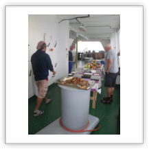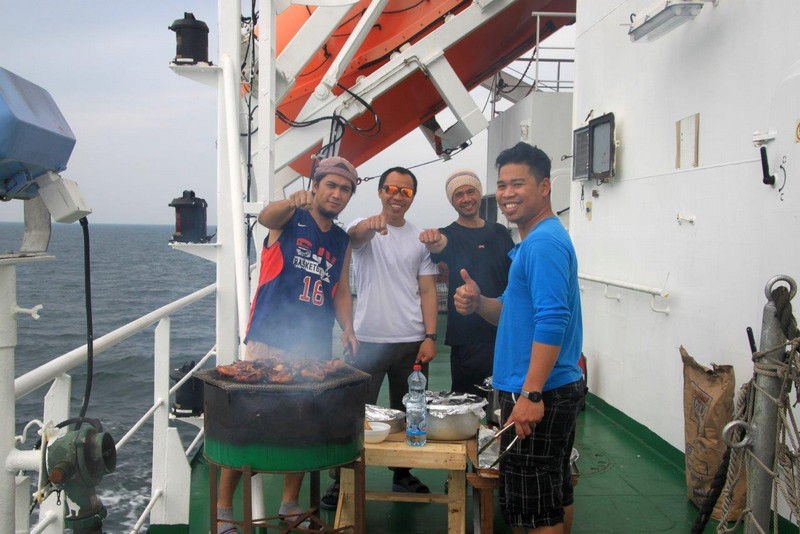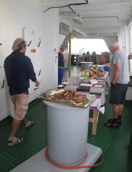 Die Geburtstagsparty für Kapitän und Bootsmann holen wir heute nach. Einige Besatzungsmitglieder haben schon am frühen Nachmittag den Grill auf dem Achterdeck in Betrieb genommen und bereiten beachtenswerte Fleischmengen vor. Anstatt Dinner gibt’s heute ein deftiges Barbeque. Da der Genuss von Alkohol an Bord prinzipiell nicht erlaubt ist, feiern wir mit Wasser und Säften. Das können auch Seeleute! Es geht erstaunlich gut.